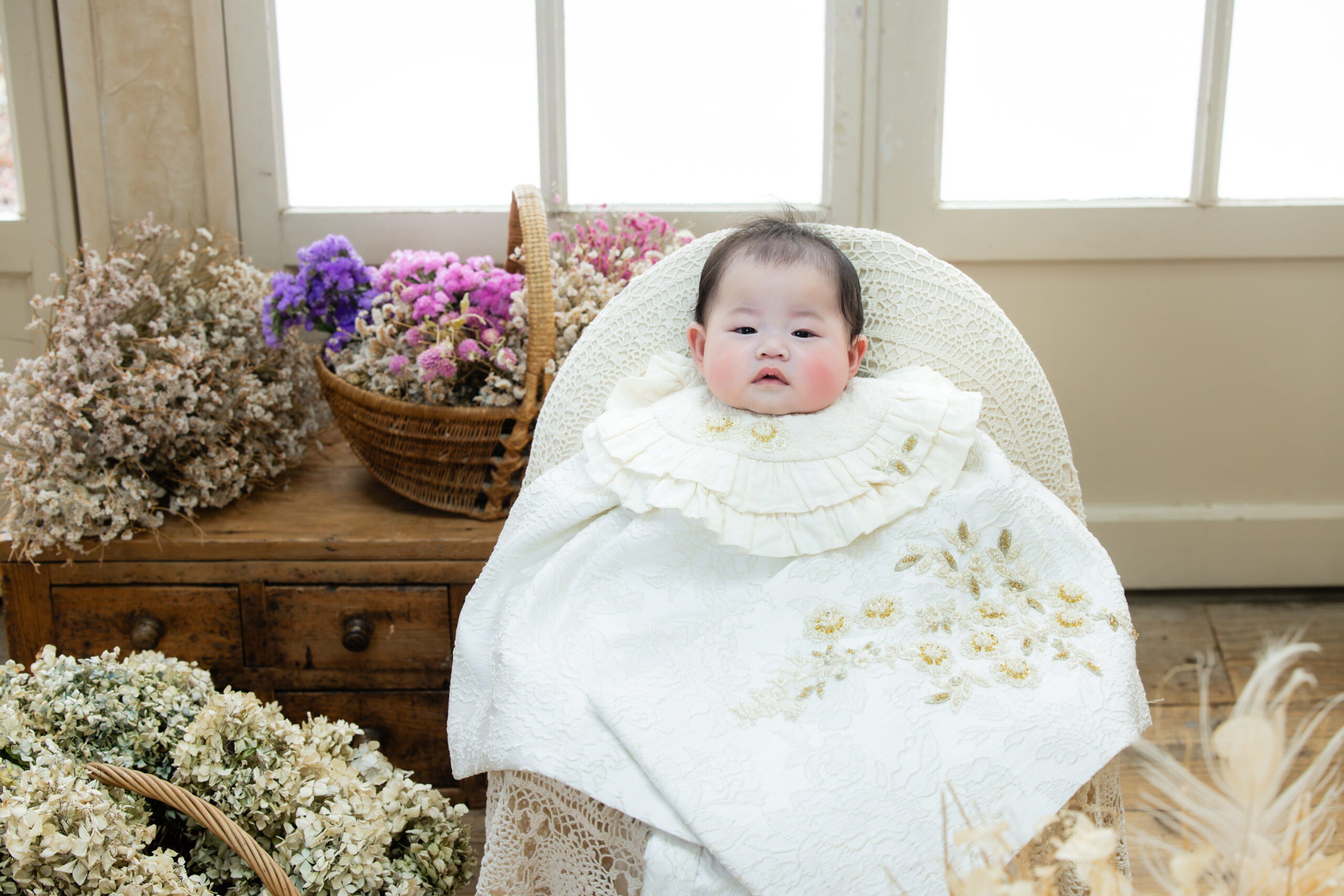 初着、セレモニードレスを多数そろえております。撮影時はレンタル無料。お宮参り時の外出初着レンタルも無料です。